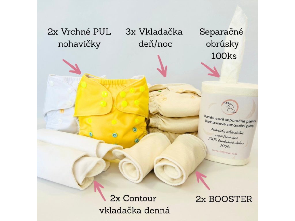 Zloženie sady Novorodenec 0-8 mes. (3-10kg): | 3x Vrchné PUL nohavičky S, 10x Vkladacia plienka S, Booster 3x, Separačné obrúsky 100ks |