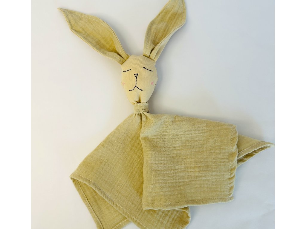 Náš ručne vyrábaný mojkáčik zajačik vzniká s láskou v našej dielni, kde dbáme na kvalitu, bezpečnosť a jemnosť každého detailu. Je ušitý z mäkkého mušelínu, ktorý je prirodzene priedušný, ľahučký a mimoriadne príjemný na dotyk — ideálny pre citlivú pokožku novorodencov a malých detí.